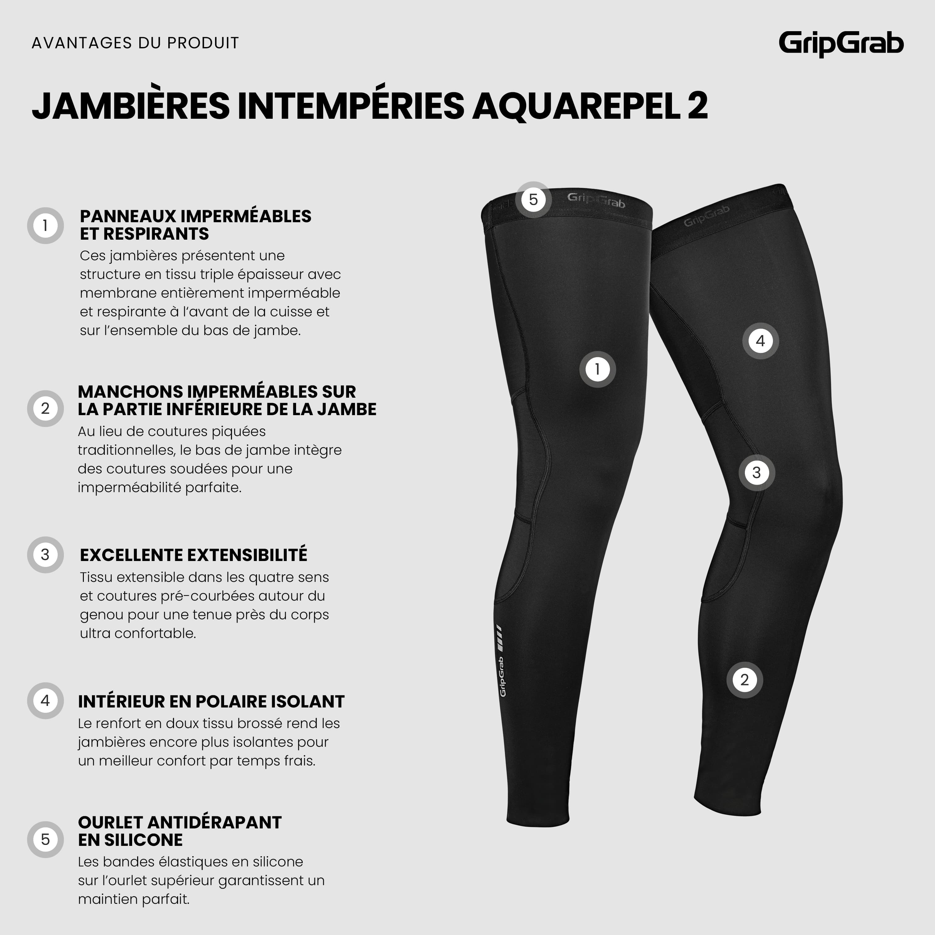 Les jambières hydrofuges GripGrab AquaRepel 2 offrent une protection sans précédent contre les intempéries. Système triple épaisseur : grâce à leur membrane 100 % imperméable, coupe-vent et respirante intégrée au tissu, les jambières offrent une protection complète pour le bas des jambes, même dans les conditions météo les moins favorables.