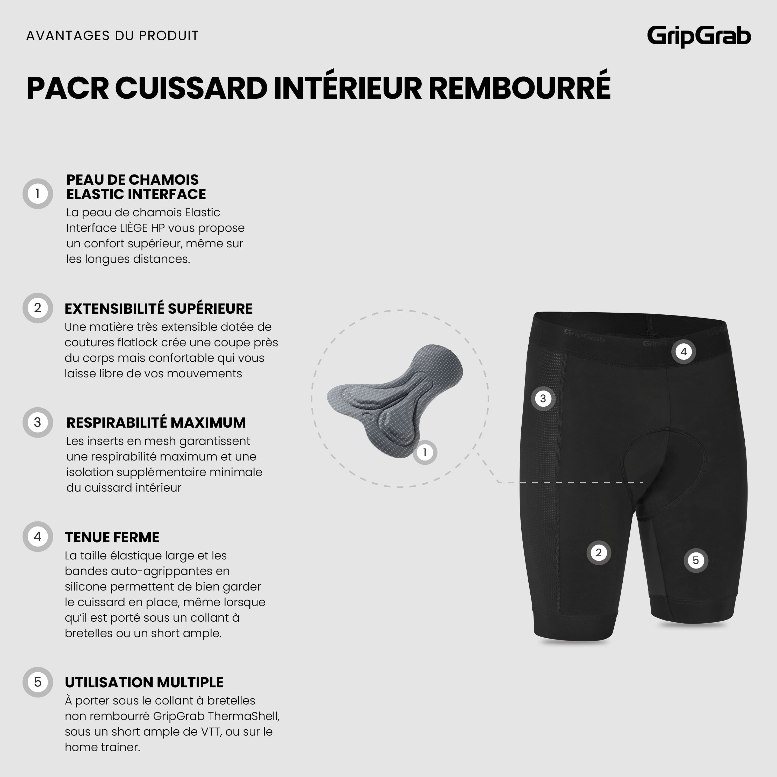 Axé sur la polyvalence, le cuissard intérieur rembourré GripGrab VentiLite peut être porté sous un collant à bretelles non rembourré, tel que le collant à bretelles GripGrab ThermaShell. Ce cuissard intérieur intègre une peau de chamois Elastic Interface pour soulager la pression et des tissus très respirants pour une régulation de la température optimale. Le cuissard rembourré sans bretelles est idéal également pour les entraînements en intérieur ou sous un short ample.