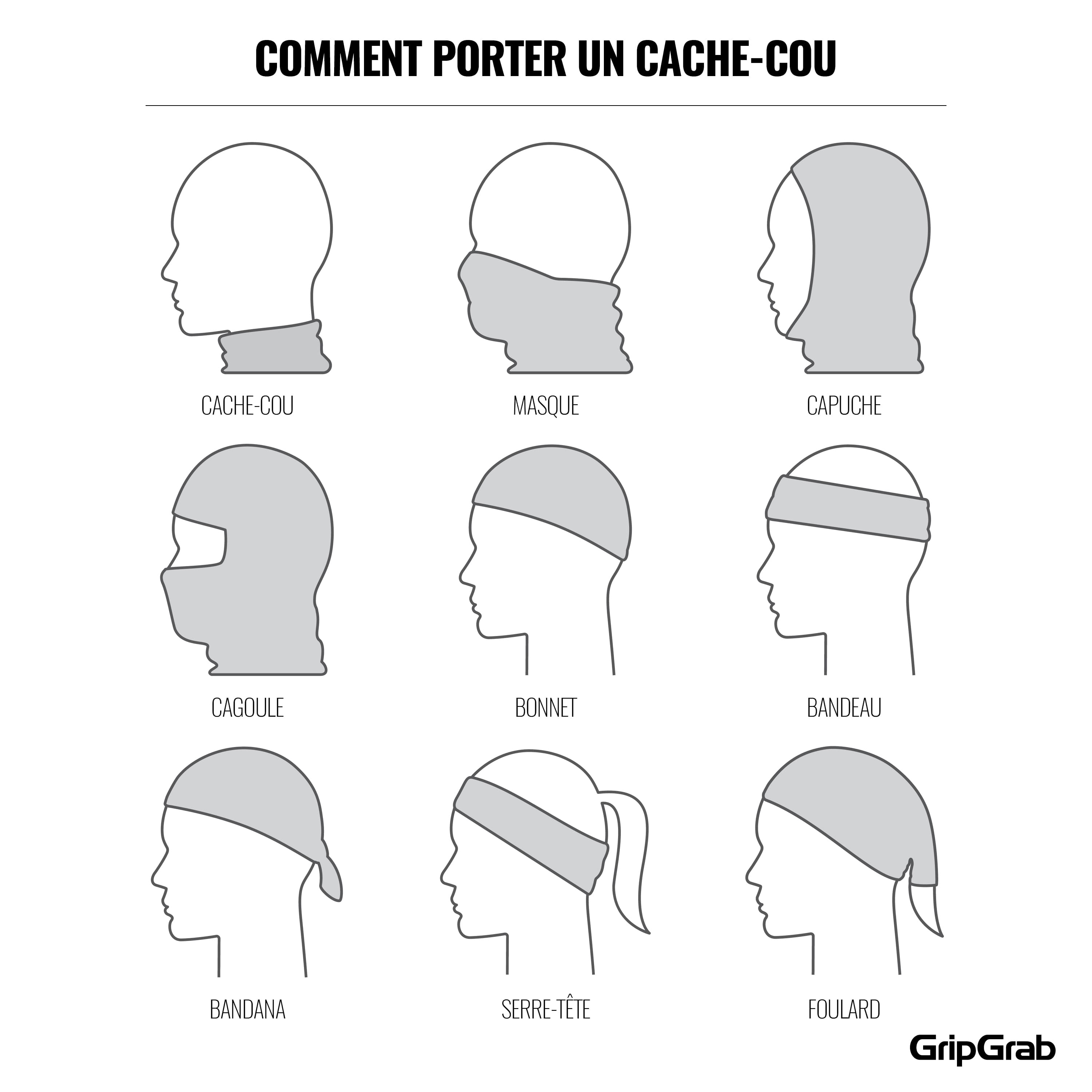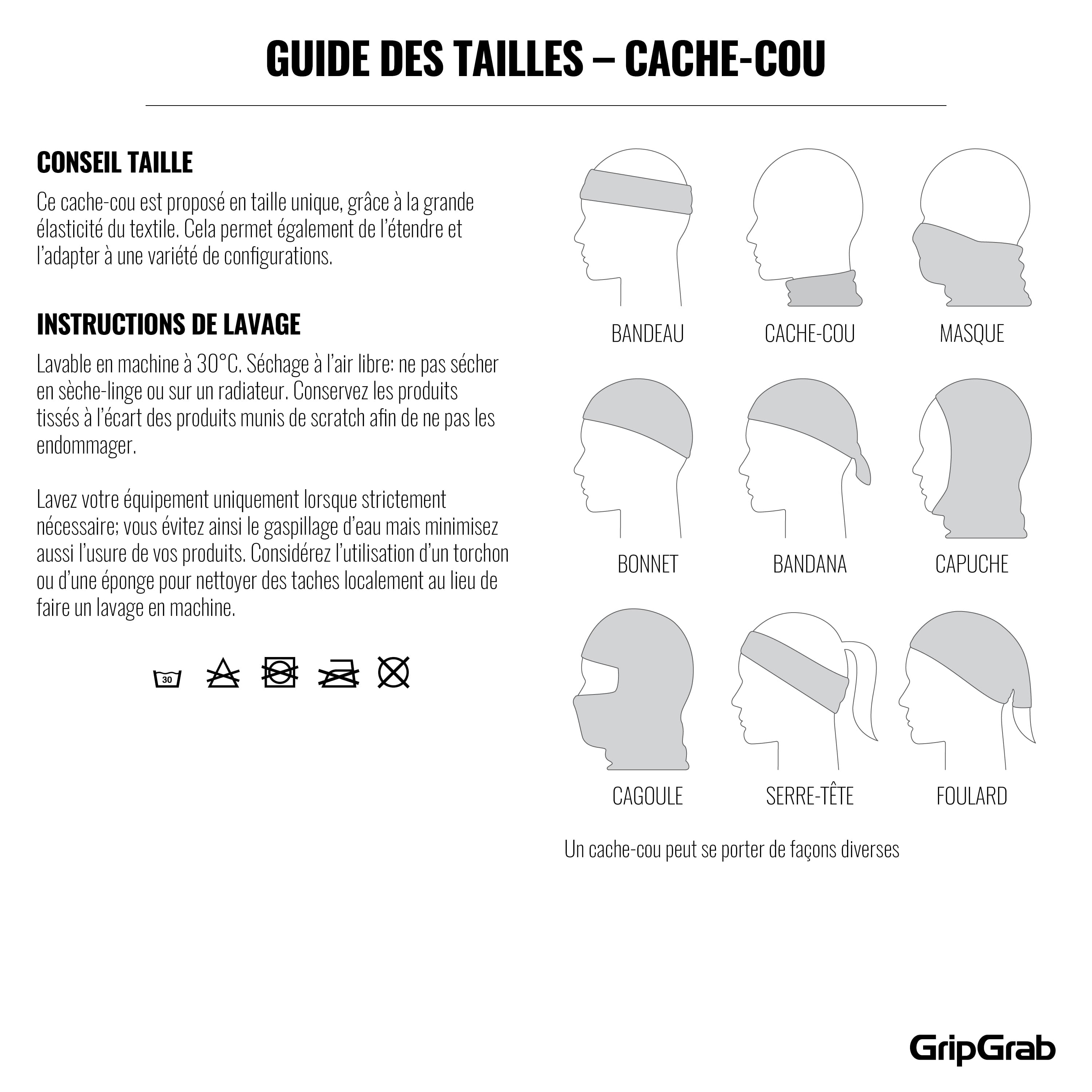 Le cache-cou est fabriqué à partir d'un textile extensible de grande qualité qui permet un ajustement serré et confortable, pour le porter de différentes manières : comme un bandana, une écharpe, un snood, un bandeau, un bracelet ou un masque pour le visage. Il est possible de porter ce modèle de différentes manières au cours de la même sortie à vélo.