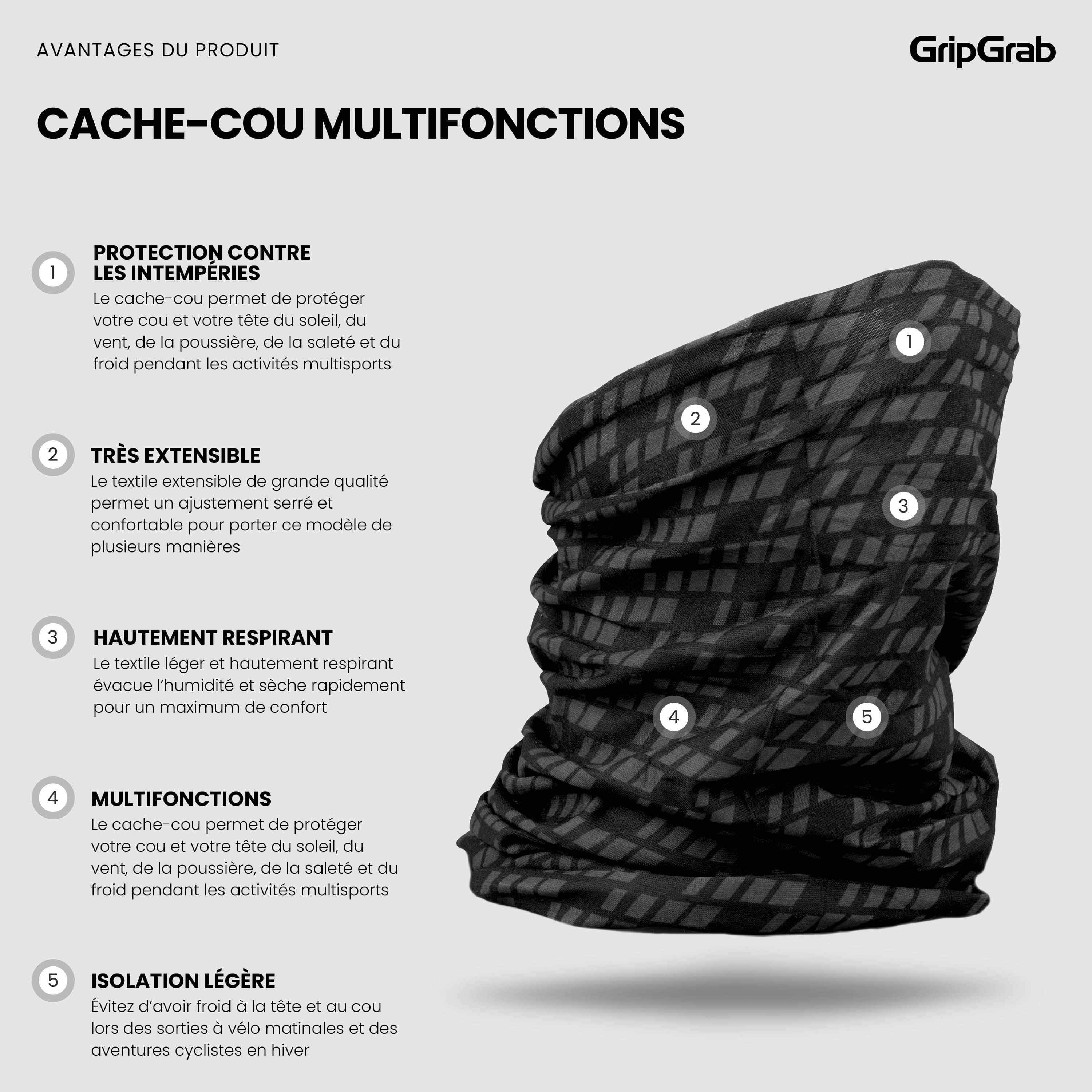 Le cache-cou Multifunctional de GripGrab est un accessoire de cyclisme extrêmement polyvalent. Portez-le pour protéger votre cou et votre tête du soleil, du vent, de la poussière, de la saleté et du froid lors d'activités multisports. Gardez-le dans votre poche ou votre sacoche pour vous protéger du froid lors des longues descentes.