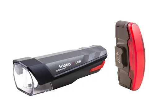 Kit d’éclairage rechargeable sur USB élégant et pratique, composé du projecteur TRIGON 25 et du feu arrière ARCO. L’éclairage avant et le feu arrière sont tous deux dotés d’une fonction de sécurité safe-switch, ce qui signifie que vous devez appuyer quelques secondes pour allumer et éteindre vos éclairages.